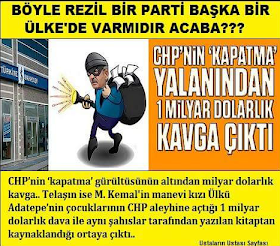 CHP’nin ‘kapatma’ gürültüsünün altından milyar dolarlık kavga çıktı. Telaşın, Atatürk’ün manevi kızı Ülkü Adatepe’nin çocuklarının CHP aleyhine açtığı 1 milyar dolarlık dava ile aynı şahıslar tarafından yazılan kitaptan kaynaklandığı belirtildi.